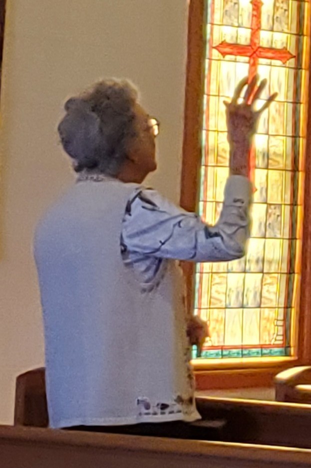 The picture shown of Miss June is during our morning church service on March 20, 2022. We were singing “We Will Worship the Lamb of Glory.”