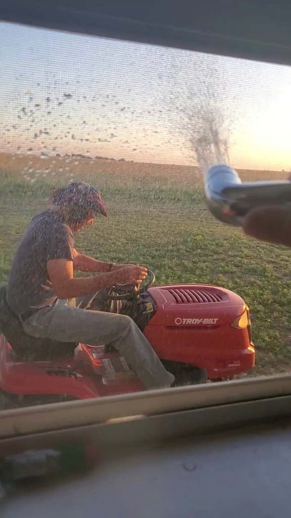 expectantly, inside the house where he could not see me. Benny wasn’t traveling the path he used to, so I put my face against the window to find his position. This morning he mowed his usual track backwards. That’s okay. I had time to wait. I lifted the window and listened for the mower. I turned the faucet on, both hot and cold. I needed all the pressure I could get. I listened for a little bit longer. When the sound got louder, I pulled the trigger. I got him! SOOOO WORTH THE WAIT!