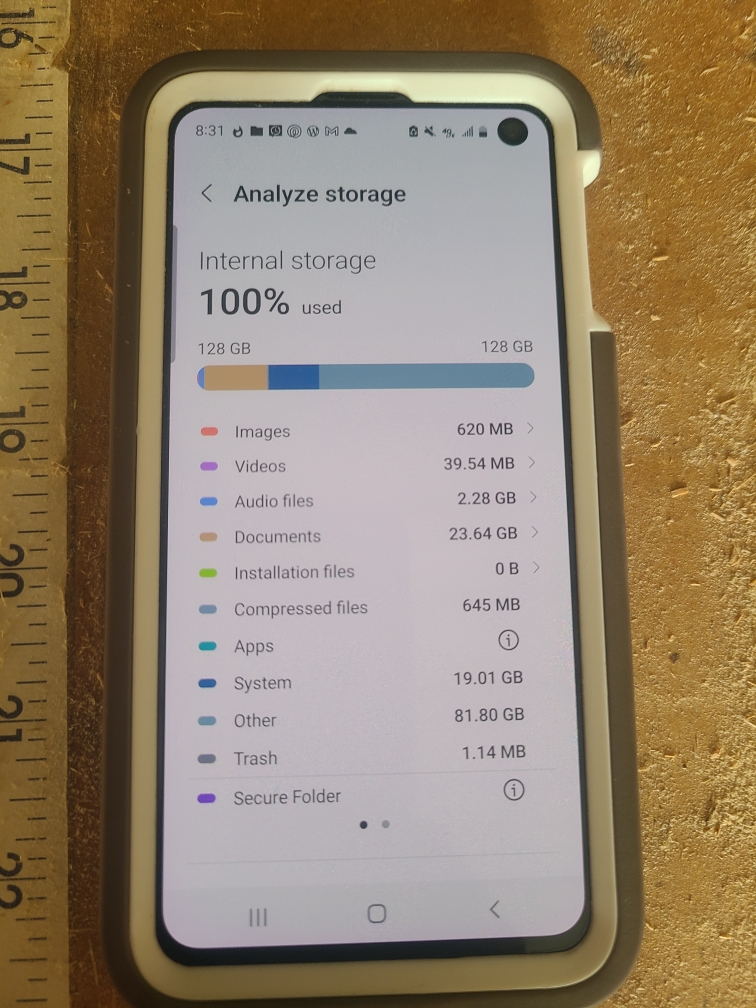 I got a message one day while my phone was acting up that it had no room left. I couldn’t even open the trashcan to delete old items. A screenshot wasn’t an option either. I had to go to Benny’s shop and ask him to take a picture of it.