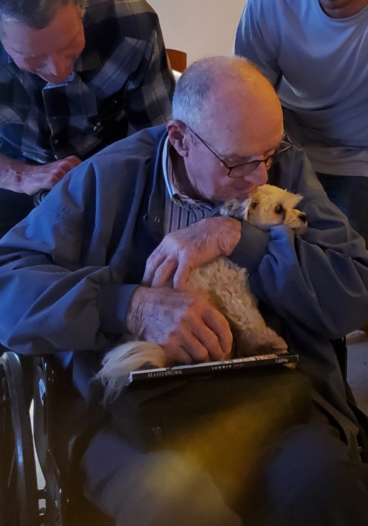 Wicket is somewhat of a furry little superstar with some of the residents of the nursing home. Many know her name, and some call out to her as we walk down the hall. Their eyes light up when they see her coming. But her eyes stay trained on Billy’s room. She knows where he stays, and her ultimate goal is to get to him. After visiting with a few new friends here and there, she gets to fulfill her mission. Wicket’s job is to sit in Billy’s lap. That’s it. Immediately, she gets in his lap, makes herself comfortable, snuggles in, and enjoys the petting, touching, and loving Billy is always ready and willing to bestow on her. When his stand stops rubbing, Wicket wiggles, and he starts again. He loves on her our entire visit.